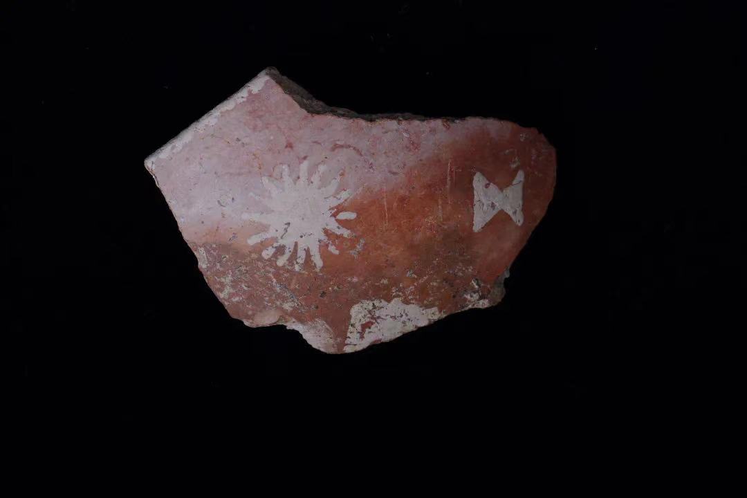 彩陶,曾经被当作黄河流域古文明的底色,是仰韶文化的代名词。其实,在上山文化所处的时代,古代先民已经学会了用色彩来创造、来表达。比如,展厅中的一块彩陶陶片,应是一钵碗类的残片,夹细砂红陶,陶质较细腻,器壁施红陶衣。口沿处有白色点彩,器壁残见三个单独的几何形图案,图形为填涂而成,与顿点连缀的点彩手法有着本质的差异。可见的两个完整图案,其一为带着一周辐射短线的圆形,似太阳纹,另一为两个顶角相对的三角形。残见图案为填涂白彩的直角。