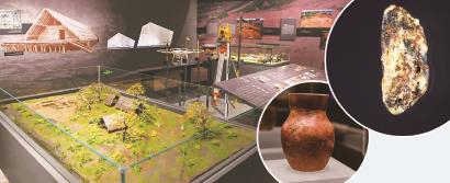 最早的定居村落遗迹(展厅现场复原)、 最早的炭化稻米、最早的彩陶。 制图:李洁