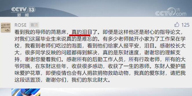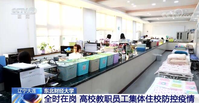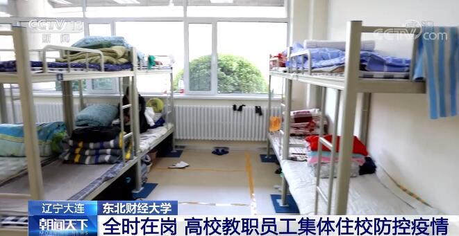 现在大屏幕上展示的就是东北财经大学最近搭建的“新型宿舍”:一排床铺紧邻工作台依次排开,后勤工作人员住校工作;简易行军床紧挨办公桌,学校行政人员和部分学术导师们也24小时在岗,与学生并肩前行;就连教室也改成了食堂大师傅们的临时宿舍。学生们一日三餐,线上学习按部就班,这背后原来是无数人的努力付出,有学生留言说,“真的泪目了”。
