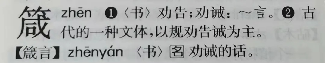 “箴”取“劝告;劝诫”之意。“官箴”,本指古代百官规劝帝王过失的箴辞,后来成为对官吏的箴言诫辞的泛称。