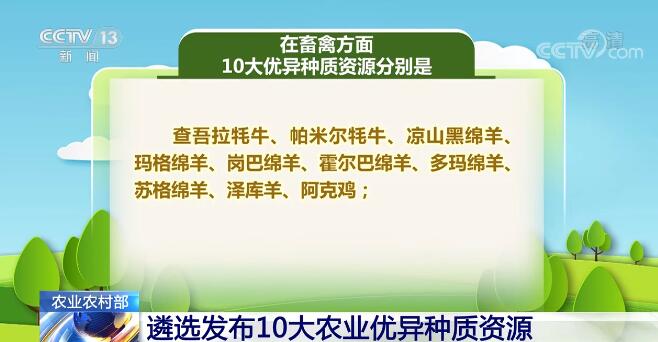 在畜禽方面,10大优异种质资源分别是:查吾拉耗牛、帕米尔耗牛、凉山黑绵羊、玛格绵羊、岗巴绵羊、霍尔巴绵羊、多玛绵羊、苏格绵羊、泽库羊、阿克鸡。