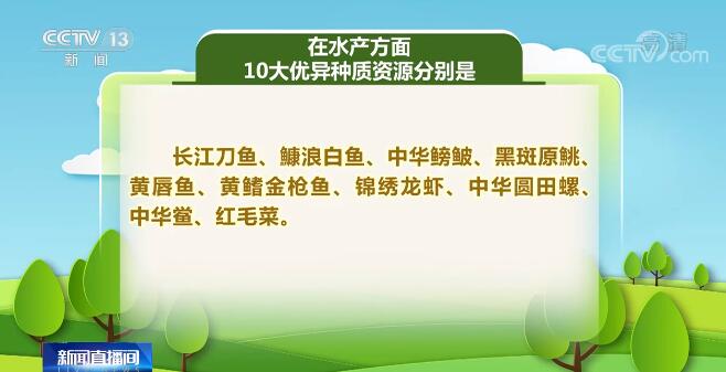 在水产方面,10大优异种质资源分别是:长江刀鱼、鱇浪白鱼、中华鳑鲏、黑斑原鮡、黄唇鱼、黄鳍金枪鱼、锦绣龙虾、中华圆田螺、中华鲎、红毛菜。
