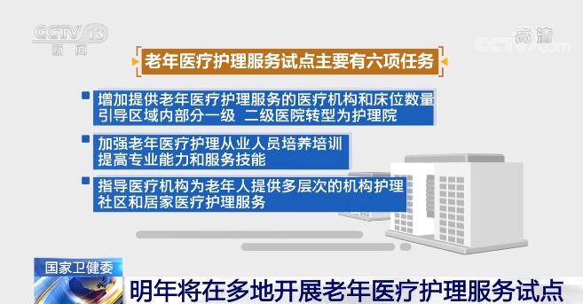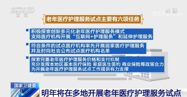老年医疗护理服务试点主要有六项任务:增加提供老年医疗护理服务的医疗机构和床位数量,引导区域内部分一级、二级医院转型为护理院; 加强老年医疗护理从业人员培养培训,提高专业能力和服务技能; 指导医疗机构为老年人提供多层次的机构护理、社区和居家医疗护理服务;积极探索创新多元化老年医疗护理服务模式,支持医疗机构开展“互联网+护理服务”和延伸护理服务; 符合条件的试点医疗机构率先开展居家医疗护理服务,并及时向社会公布试点医疗机构名单;探索完善老年医疗护理服务价格和支付机制,充分发挥本地区基本医疗保险、家庭医生签约、商业保险等政策合力,为开展老年医疗护理服务试点工作提供有力支撑。