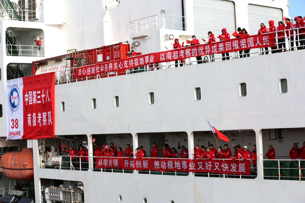 11月23日,中国第38次南极科学考察队员在船上向送行人群告别。