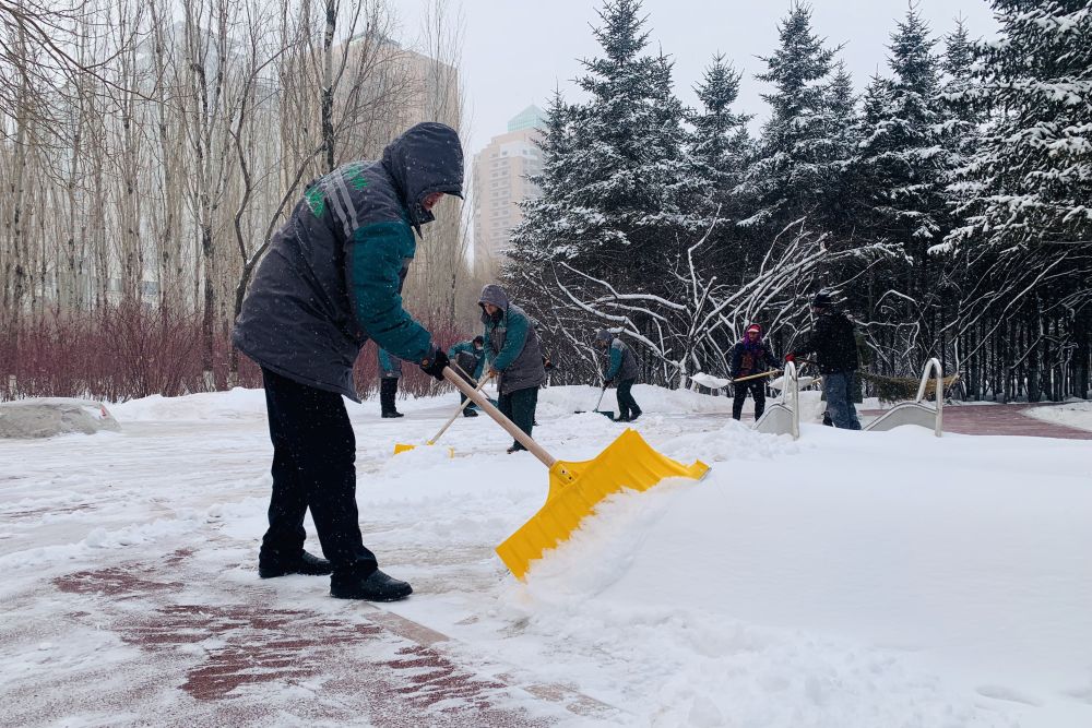 哈尔滨市南岗区园林局工作人员在公园内清雪。(受访者供图)