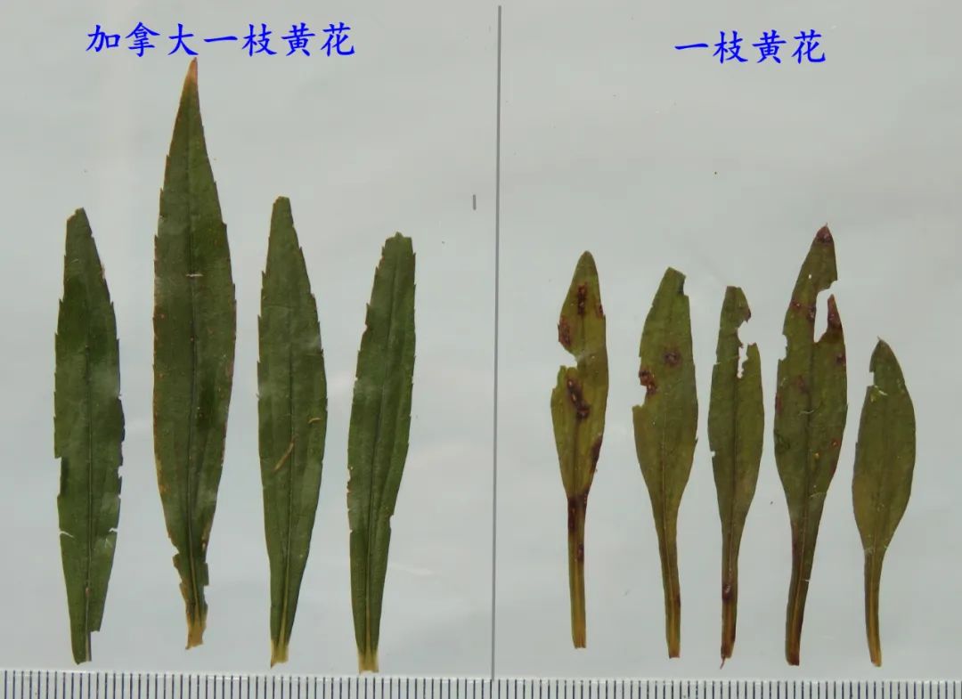 加拿大一枝黄花和一枝黄花叶形对比 图片来源:冬凌草