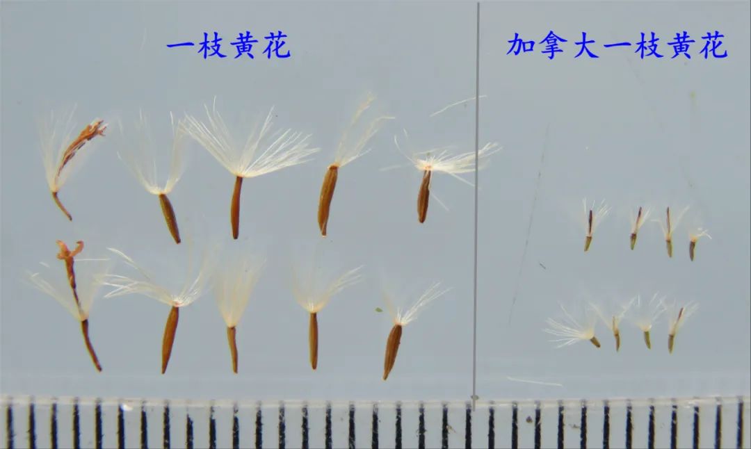 一枝黄花(左侧两个未成熟)和加拿大一枝黄花种子对比图 图片来源:冬凌草
