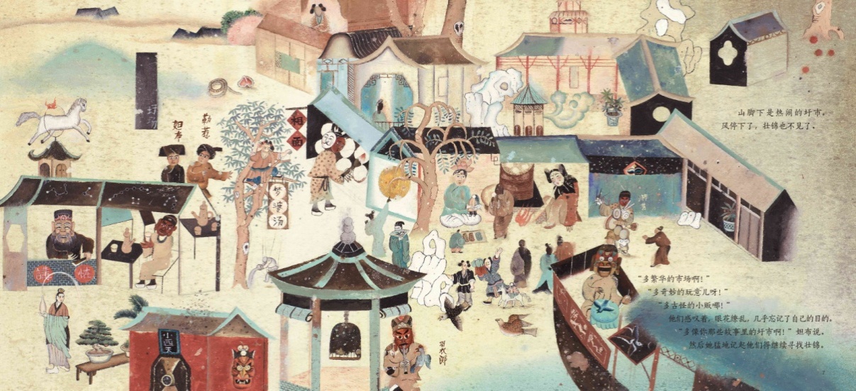 以《神奇的壮锦》为例,该绘本的创作足足历经了两年时间。此次展览还原了其诞生的过程,介绍了广西壮族非物质文化遗产壮锦的文化特色,以及织锦所需的基本工具。与此同时,展出了九九为《神奇的壮锦》所绘插画的原作,每一页都是一幅精美的民俗风情画。这些插画的画面极富想象力,画家借鉴了壮锦和壁画的叙事方式,再现了广西民间故事《一幅壮锦》中壮丽奇幻的寻锦之旅。