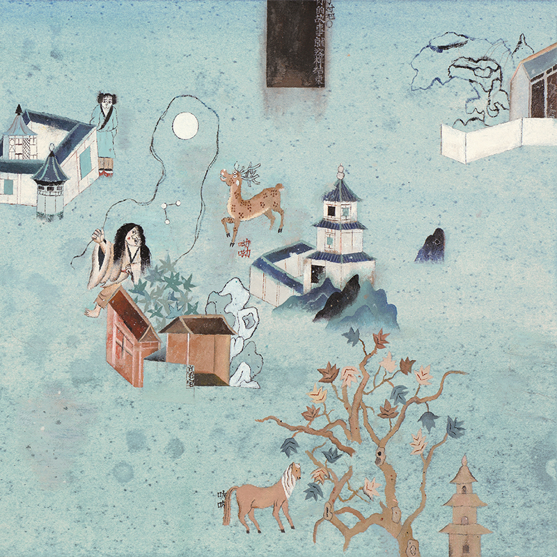 在这里,现实与想象的边界被打破,你会发现圩场上不仅有平常的商贩,还有神话传说里的各种角色,热闹非凡。比如,你会在插画中看到“羽衣郎”,他身上穿着一袭画着很多鸟的衣裳,胳臂上还停着一只大鸟,而羽衣郎正吹着萧,但这个人根本在故事中没有被提及;插图中还可以看见白马在跳火圈,甚至还出现梦婆汤等稀奇古怪的事,可以看到创作者的用心和巧思。