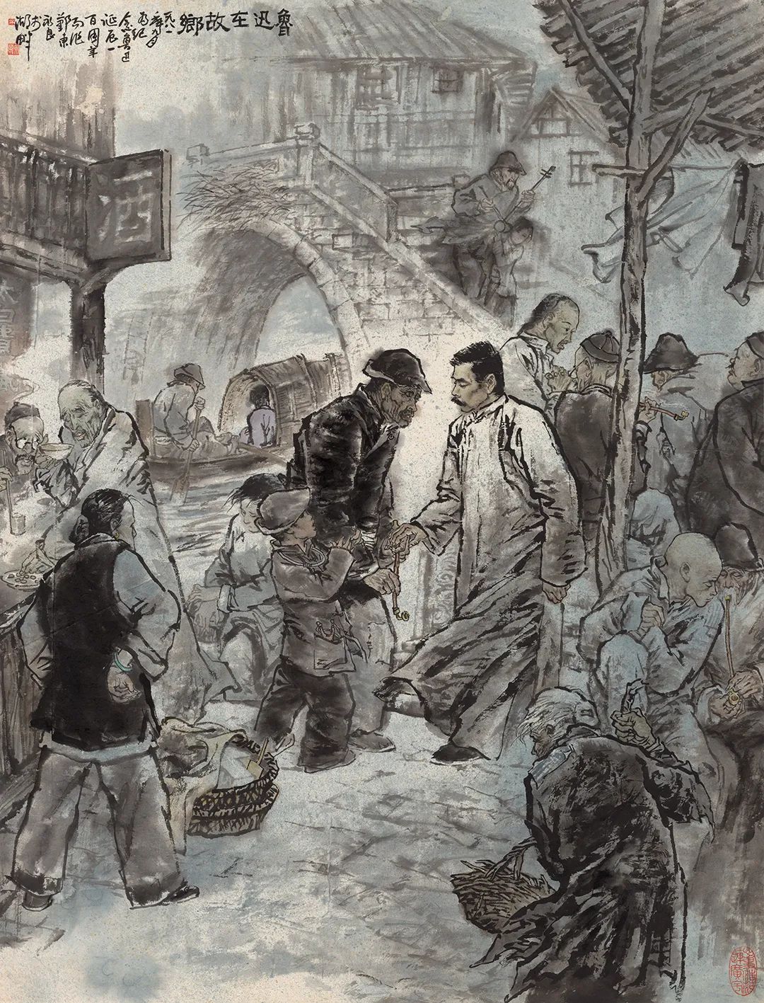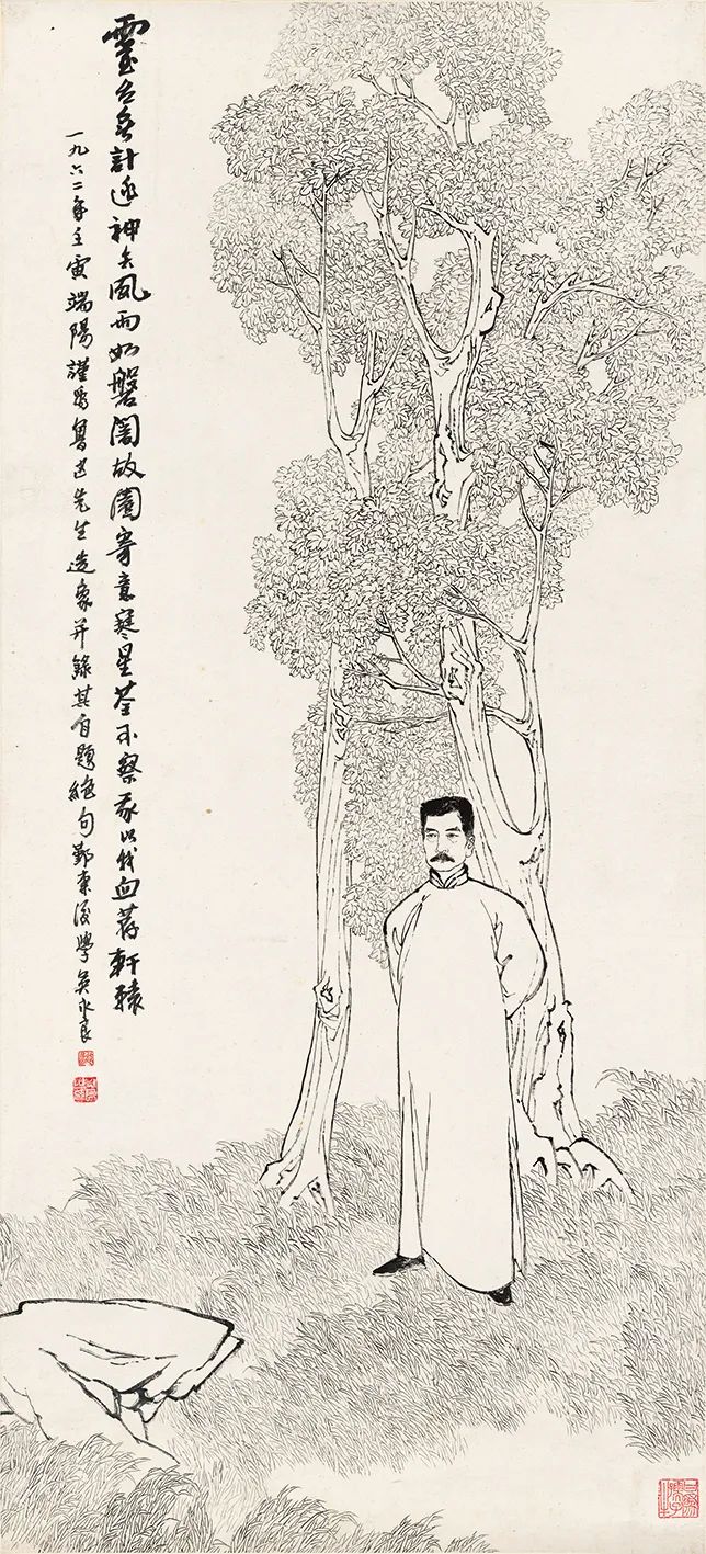 吴永良老师的画作中,令我印象最深的是他笔下的鲁迅。鲁迅先生是二十世纪美术史上的重要题材,画过鲁迅的优秀画家不知凡几,而吴老师却独辟蹊径,塑造出了特色鲜明的鲁迅形象。他1962年的毕业创作纯以白描手法表现,鲁迅先生负手而立,堂堂正正,磊落从容,背后两株高大的枣树自然是来自《野草》中的叙述。画面布局疏密有度,无论是人物的疏朗峻拔,惜墨如金,还是草木的绵密紧致,条理分明,都显示出其造型的坚实精准、笔法的简净洗练。