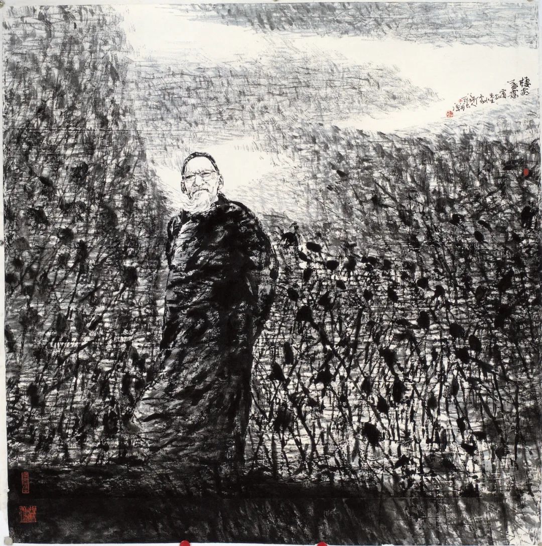 吴先生是真正的多面手。他善笔。早在毕业创作《白描鲁迅》中,就展现了对于用线来描画风神的禀赋,引得潘老的点头称赞。那点点劲草、丛丛繁叶,衬着一人、一石、二树,干干净净,坦坦荡荡,卓然而立,直写中国文化旗手硬汉的骨气。画于2006年的《雷婆头峰寿者》,来自潘老当年的黄山旧照,却将苍松涯石的墨色皆滤去,凝成潘老的指墨酣动、一味霸悍的用笔,横入斜出,笔意扛鼎,活现潘老先生的铮铮硬骨。