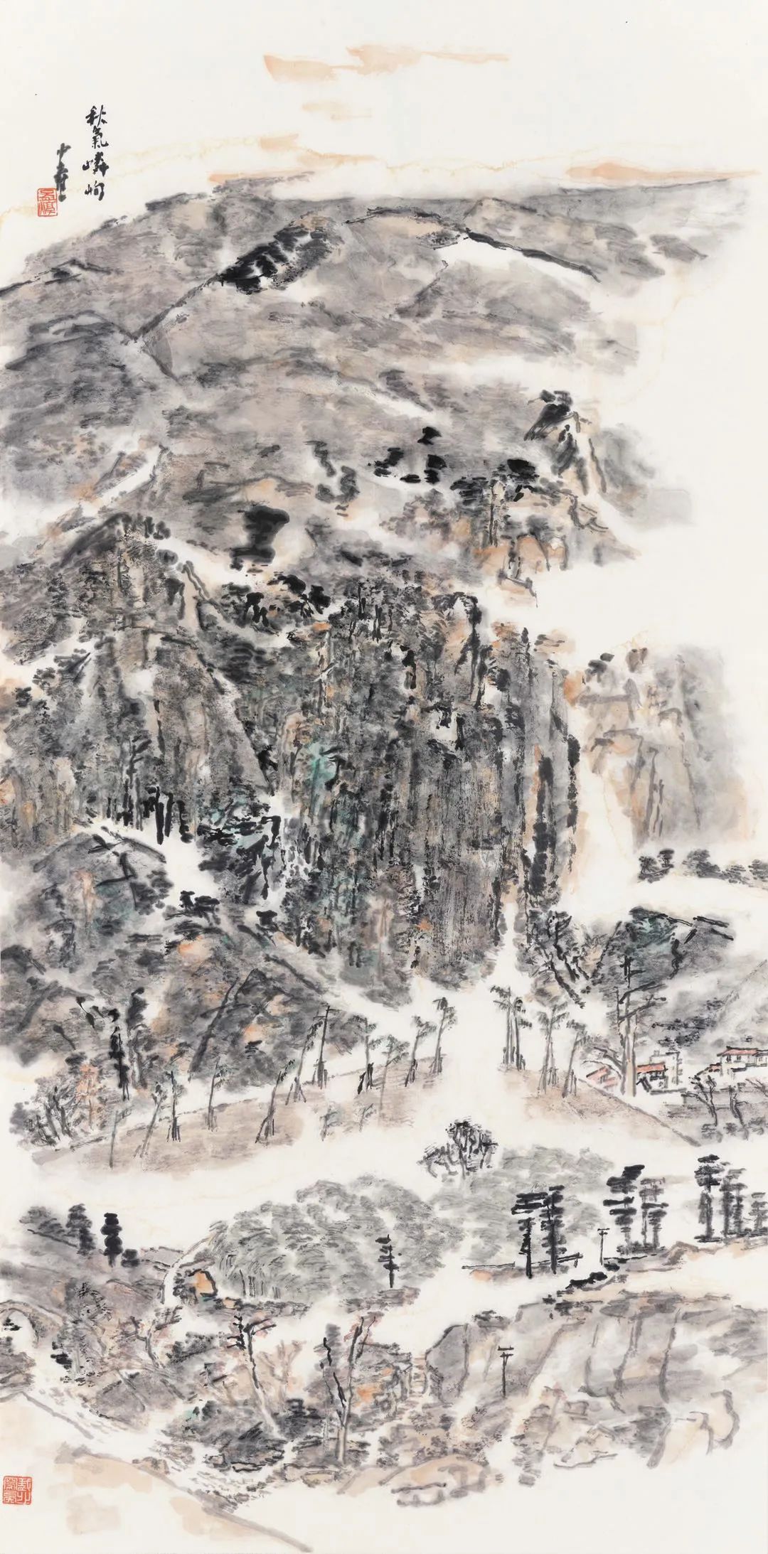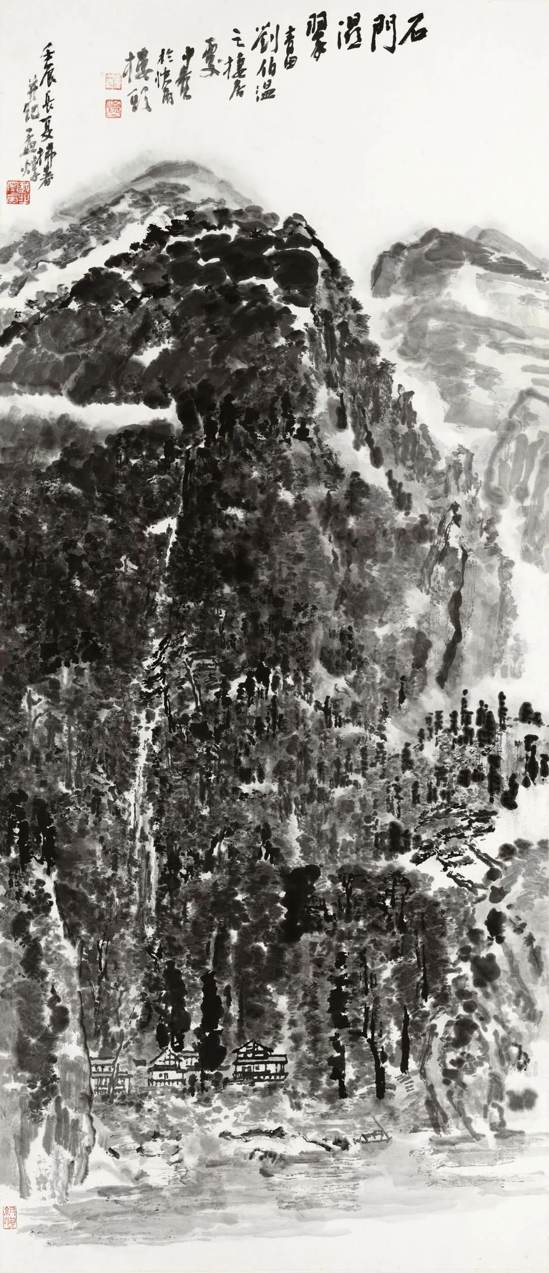 凡写生创作,抓住景物的个性化特色,达心之所往,是笔墨表现之重。在此幅中,“湿”与“翠”两字,便是搜罗自然、体悟达心、研磨至理的笔墨之重点。奇峰沐雨,山岚微湿。远观,林木葱郁,山色凄迷,焕发青翠的光晕。近看,树木积点成林,山岳积点成体。有界的笔墨和多层次的艺术表现因素,与无界的留白关联、贯穿、相融,形成万物生机复苏的意境。