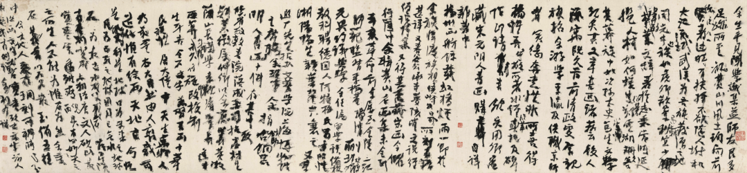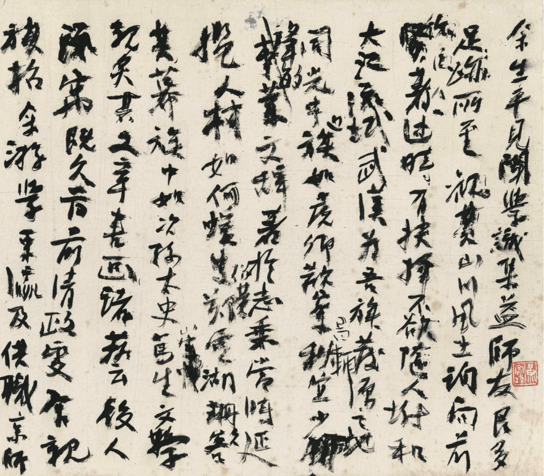 黄宾虹先生这幅书法,沉郁朴厚,看似粗头乱服,却是勾勒如枯藤,点叶如坠石,布白如虫蚀,皆承乎书家理法。结体成字以及在通篇的布局安排上,有颜鲁公的笔法结构,在具体用笔用墨上,有碑摹拓的斑驳金石之气,同时又将草书的使转融入其中。他的用笔功夫是惊人的!顿、挫、提、按、翻、擫、转、推、捻、截等等笔法,运用自如。用墨将浓欲枯,将枯见润,渴笔挥扫,笔笔入纸,如飞檐走壁,险峻行进,但又坦荡沉稳。他在给弟子朱砚英的信中说:“古代遗传真迹,认识前人真内美各有不同,不为时好邪甜俗赖众恶所遗夺。”(《黄宾虹文集》)这些对于他的笔墨表现,都是极好的印证。他在理解古代书家的结字用笔的内美上精研深摩,这一点是理解探求黄宾虹书画成就的关键。他与林散之先生在书画上多有切磋,宾虹先生曾在与他的信中说:“古画大家全于笔墨见长,溯源籀篆。悟其虚实,参之行草,以尽其变。”他在信中道出了古代大家取得笔墨成就的原因。而他的这幅书法,正见其在研究古人笔法之后,在自身书法创作上的实际运用。