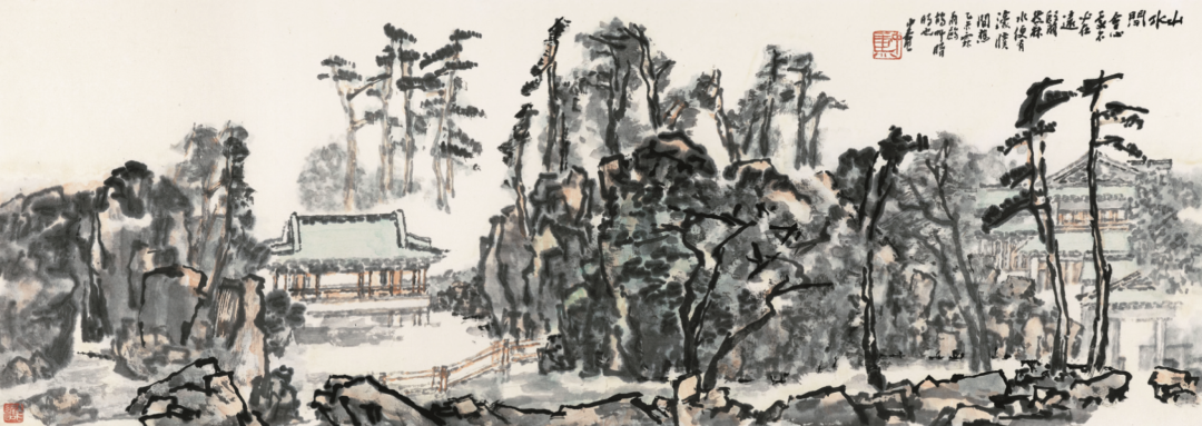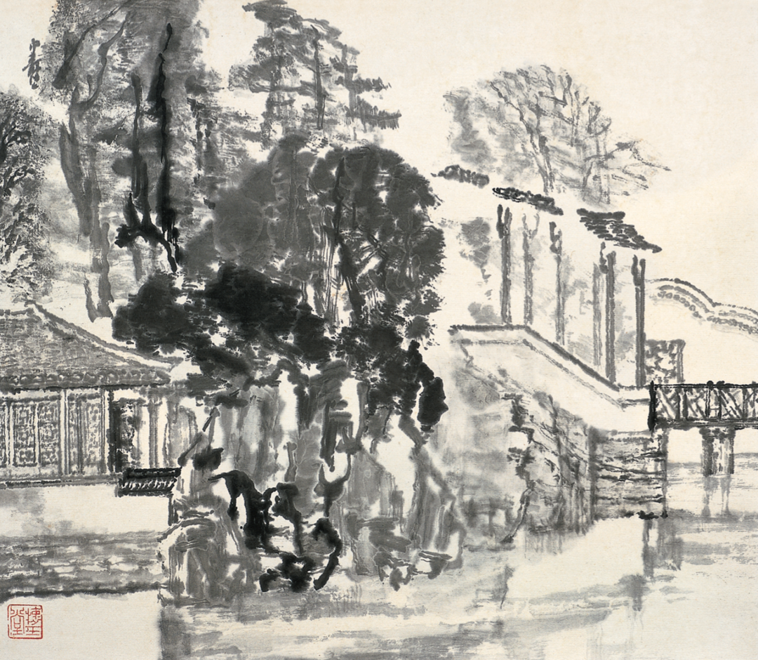 画面的简当舒放,在于对笔墨认识和笔墨与心灵的同构,这需要抓住核心主题,来建构形式与内容合一的凸显。《园林一隅》的静波水岸、浓深树丛,衬托着前景,笔致工整的翘角白墙黑瓦,又反衬空托翘角的亭廊,直以留白凸显枯笔的韵致,正如《南田论画》中所说:“笔墨简洁处,用意最微。运其神气于人所不见之地,尤为惨淡。此惟悬解能得之。”因而抛开繁琐的沉渣之思与虚浮的对象外饰,捕捉自觉所感,直扣心之所望。