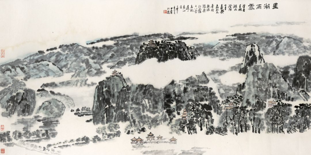 在《星湖雨霁》中,树干勾勒,树叶排叠,无一雷同。每一山,有一个性。或线面结合,留白结顶;或以面为主,勾勒辅之;或积点成面,见笔铺毫而成。《易·系辞》言“生生之谓易”“通之为事”“化而裁之谓之变,推而行之谓之通”“通则变,变则久”。世界是变化的,笔墨在变化中发展。