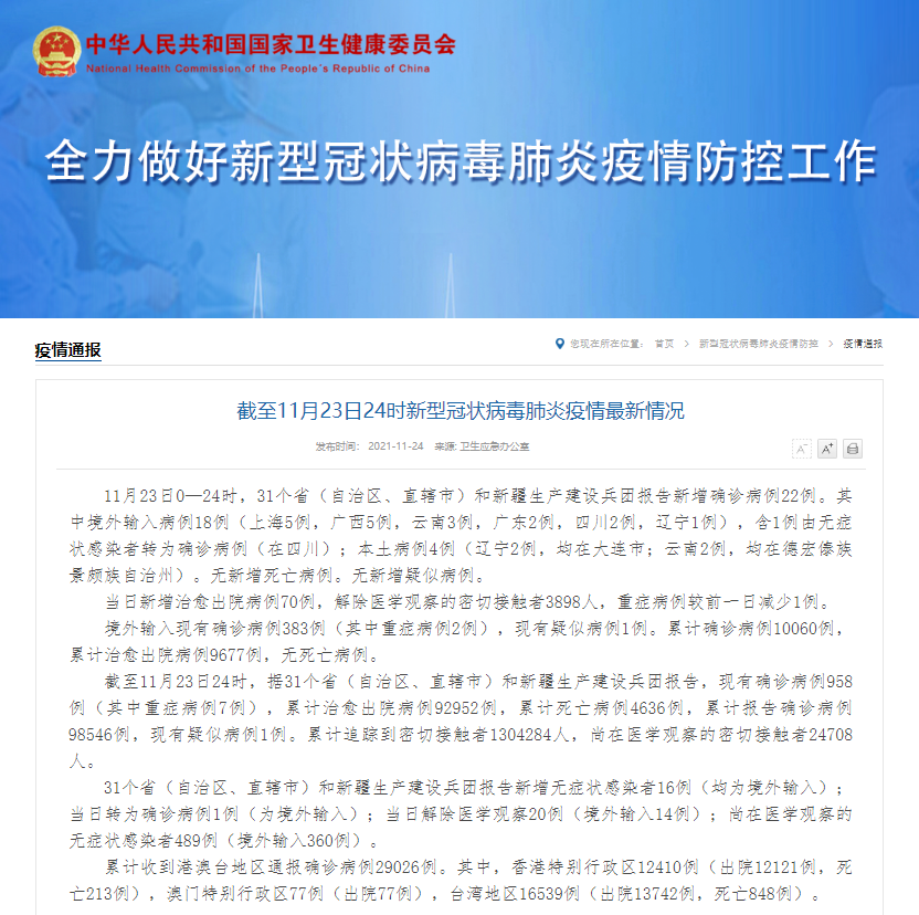 截至11月23日24时新型冠状病毒肺炎疫情最新情况