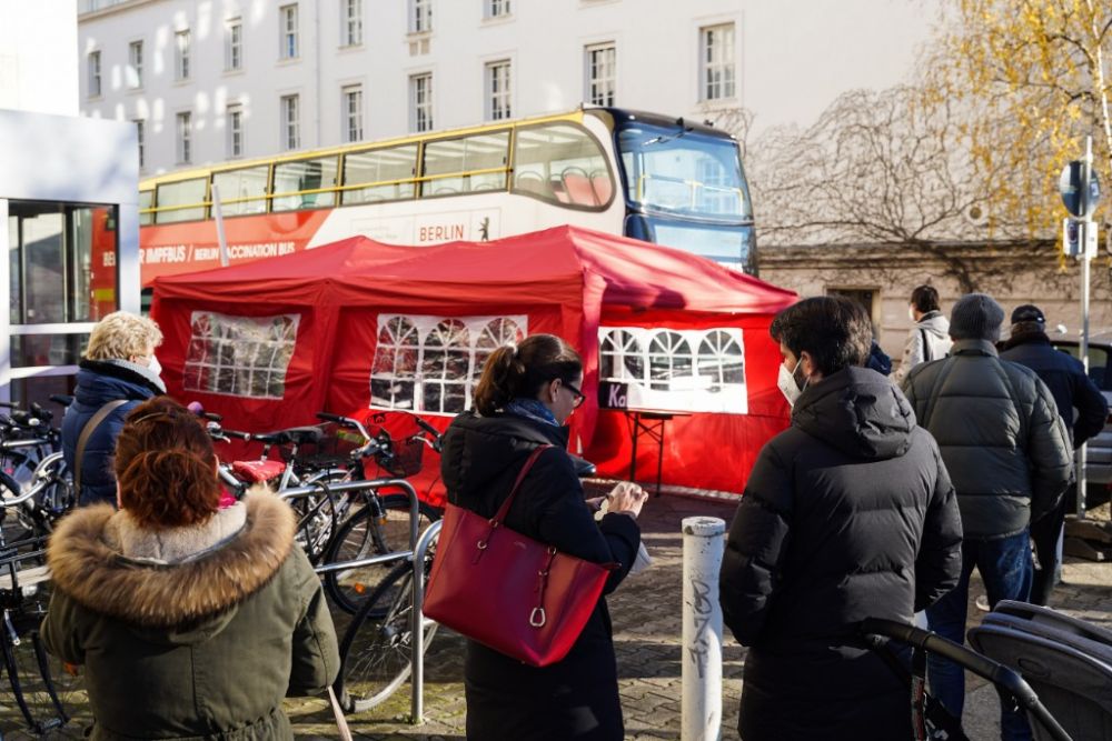 11月22日,人们在德国首都柏林一辆“疫苗巴士”前排队等待接种新冠疫苗。(新华社发,斯特凡·蔡茨摄)