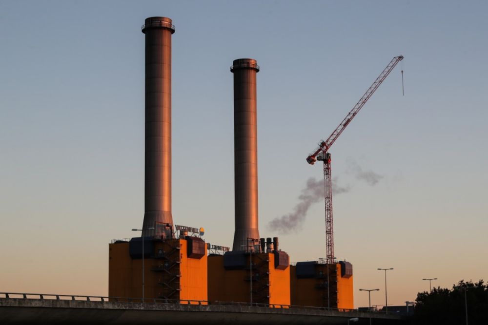 这是10月9日在德国首都柏林拍摄的一座正在拆除烟囱的热电厂。(新华社记者单宇琦摄)