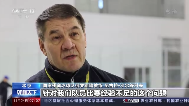 国家残奥冰球队俄罗斯籍教练 尼古拉·沙尔舒科夫:针对我们队员比赛经验不足的这个问题,我们在训练过程中,尤其是近一年的训练过程中,进行了大量的模拟比赛训练,完全模拟国际比赛的模式,穿不同的比赛服,进行不同队伍的一个对抗。我们会一直坚持对队员的体能和战术训练,带领队员观看学习和分析国际强队的比赛视频,了解他们的优势和他们的不足,最重要的是教会队员学会和不同的队伍进行比赛对抗。