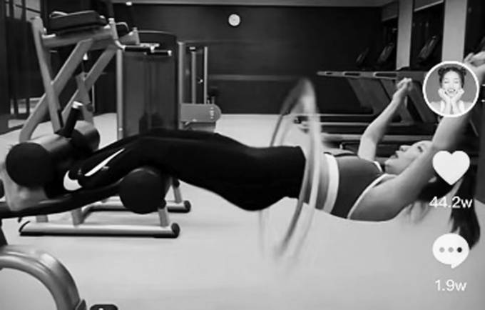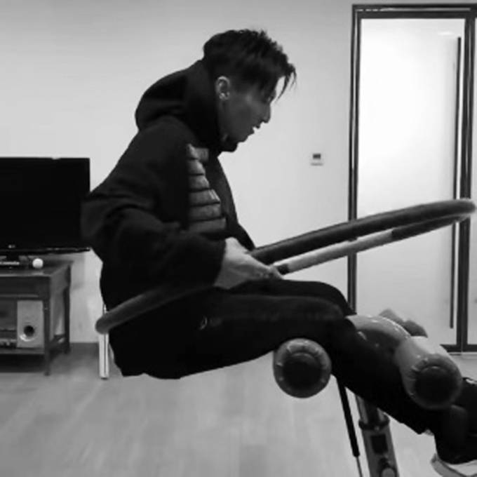 视频的开头,谢霆锋提到前两天看到一位健身达人说:有一个健身动作的难度极高,他决定要试试。接下来,他便坐上腹肌凳的一边,双腿夹紧支撑点,将呼啦圈放置于腰部,上半身悬空躺下,同时腰上转起了呼啦圈;视频中的他非常轻松地完成了动作,其间还让旁人递来手机,就这样一边刷手机,一边悬空转呼啦圈。