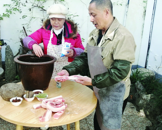 一大早,胥江社区工作人员准备好了猪肉、盐、花椒、腌缸等材料,阿姨叔叔们撸起袖子跃跃欲试。“到了小雪节气了,天气越来越冷,我们‘老苏州’最喜欢在家腌肉了。”家住沧浪街道胥江新村的陆美华算是资深美食达人,当天,在胥江社区活动室里,陆阿姨和老伴钱老伯又一次展示了手艺。陆美华将五花肉一条条摊开来,在两面撒上粗盐,用手不断揉搓着表皮,一块块新鲜的五花肉在陆美华和老伴的手中反复揉搓,得到了充分“按摩”,满满渗出了“汗液”。“揉搓也是个技术活,力度太轻和太重都不行,必须让肉微微出水才行。”钱老伯边揉边向居民传授揉搓经验,在放入缸中之前,钱老伯开了一小瓶白酒洒在了五花肉上,面对年轻居民迷惑的表情,钱老伯向他们解释道:“洒点酒可以杀杀菌,而且还能让腌肉有种特别的香味。”大家按照陆阿姨和钱老伯的方法,亲手操作了一番,年轻居民在阿姨们的手把手教学中也做得有模有样。居民赵阿姨还开玩笑说道:“简直就像在给五花肉做SPA按摩了。”