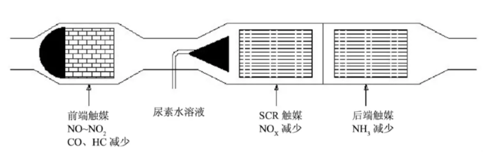 前端氧化催化系统→中端喷射混合和催化还原系统→末端氧化催化系统