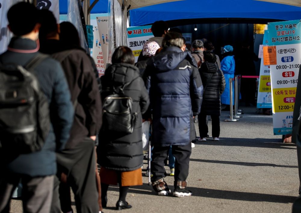 11月24日,民众在韩国首尔一处新冠病毒检测点排队等待。(新华社/纽西斯通讯社)