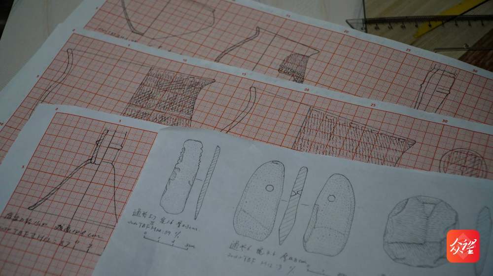 在方田坝遗址发掘清理的一年多时间里,韩继泽已绘制了近百件文物“证件照”。