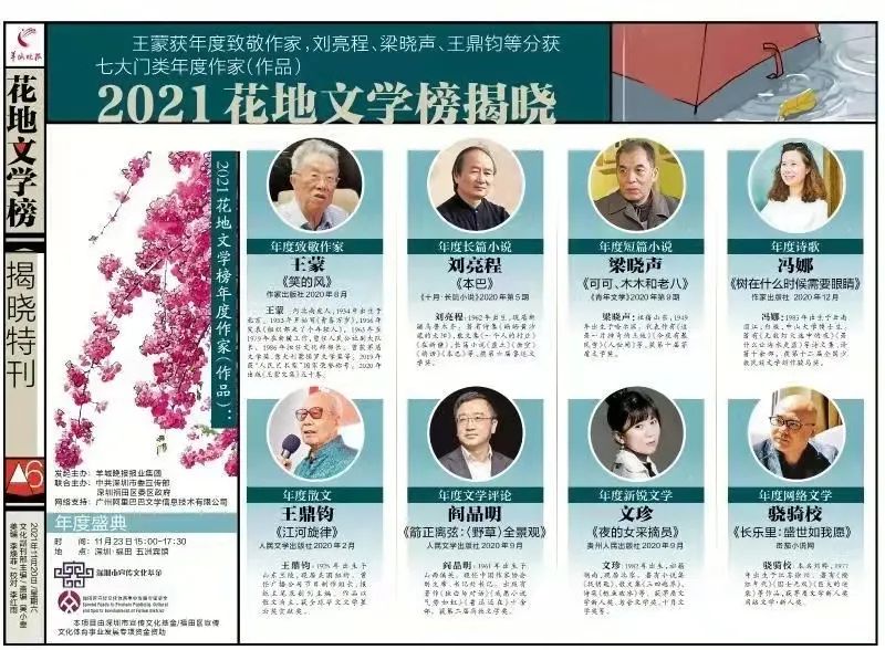11 月 23 日,“2021 花地文学榜”在深圳揭晓。王蒙获“年度致敬作家”,刘亮程、梁晓声、冯娜、王鼎钧、阎晶明、文珍、骁骑校分获七大文学门类年度作家(作品)。