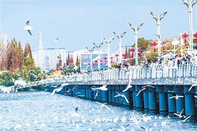 近年来,“春城”昆明高质量发展势头良好,滇池生态环境不断改善。图为11月21日,游客在滇池海埂大坝上观赏红嘴鸥。新华社记者 陈欣波摄