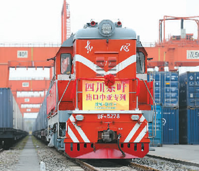 成渝地区双城经济圈位于“一带一路”和长江经济带交汇处,是西部陆海新通道的起点。图为11月22日,四川茶叶出口中亚专列从成都国际铁路港启程前往乌兹别克斯坦塔什干。白桂斌摄(人民视觉)