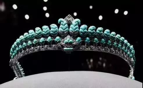 卡地亚设计,1936年 铂金、旧式单面切割钻石、雕花绿松石。 受俄罗斯芭蕾舞和东方精巧模型的影响,用以炫耀的钻石白鹭毛及稀有羽毛的头饰出现在波斯人的舞会上。一旦成为一种流行时尚,卡地亚就会借鉴其颜色和设计,比如借鉴波斯人或印度人的设计。卡地亚将棕叶嵌入绿松石中装饰皇冠。