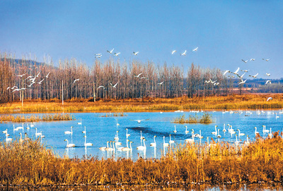 在三门峡市境内黄河湿地越冬的白天鹅。程专艺摄(人民视觉)