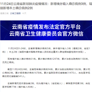 原标题:11月24日云南省新冠肺炎疫情情况:新增境外输入确诊病例3例,瑞丽新增本土确诊病例2例