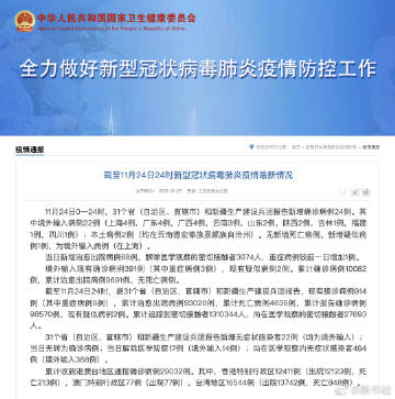 【#11月24日新增确诊病例24例# #11月24日新增本土病例2例#】据国家卫生健康委员会官方网站,11月24日0—24时,31个省(自治区、直辖市)和新疆生产建设兵团报告新增确诊病例24例。其中境外输入病例22例(上海4例,广东4例,广西4例,云南3例,山东2例,陕西2例,吉林1例,福建1例,四川1例);本土病例2例(均在云南德宏傣族景颇族自治州)。无新增死亡病例。新增疑似病例1例,为境外输入病例(在上海)。