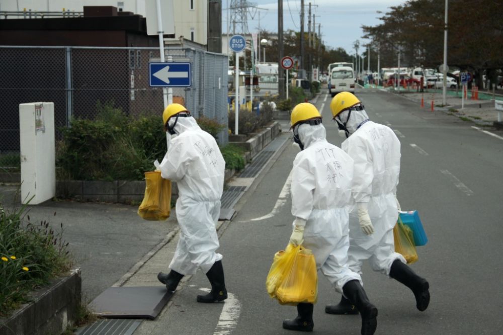 2017年10月12日,身着核防护服的施工人员从日本福岛第一核电站内走过。(新华社发)