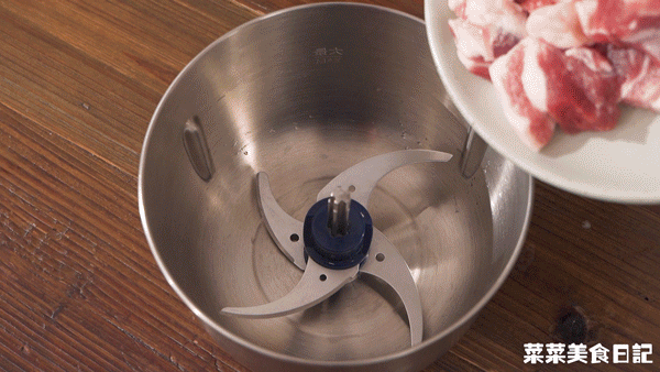2.绞肉机倒入300g切小块的后腿肉、1小勺盐、3大勺清水,高速搅打1-2分钟,让肉吸收水份