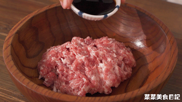继续加入2大勺生抽、1/2小勺糖、1小勺白胡椒粉、2大勺虾皮、浸泡的紫菜拌匀,最后加入1大勺麻油封住调料