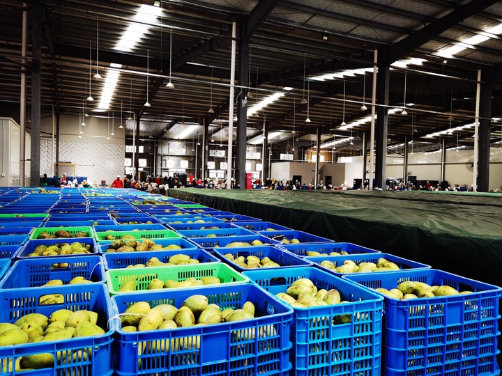 这是10月21日在柬埔寨磅士卑省尖山县中宝(柬埔寨)食品科技有限公司芒果干生产厂房内拍摄的堆放的芒果(手机拍摄)。新华社发(陈其生摄)