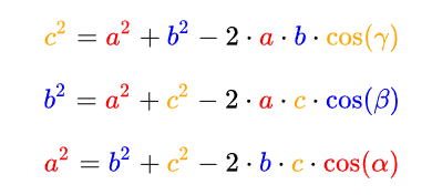同样在上图中的任意三角形中,合理利用余弦定理公式,也能帮助你找到用白球A将球B击入球洞C点的最佳方案。