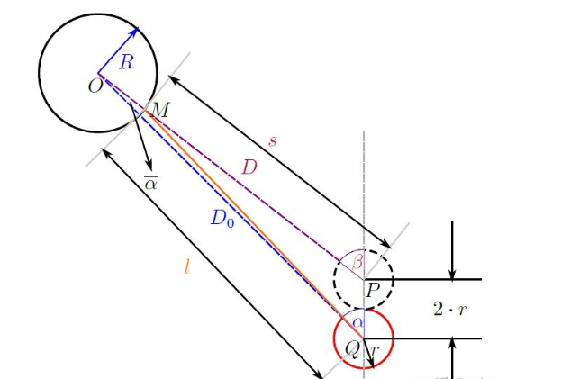 第二个问题关于母球与各个球心之间距离则有如下解释,如上图所示,D代表母球与进球点之间的距离,母球球心与目标球心之间距离D0,角度α,β,则可得出各变量之间关系为: