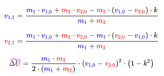 当k=0时为完全非弹性碰撞,当k=1时,为完全弹性碰撞。对于一个实际碰撞问题来说,两球碰撞后速度和内能转化,都可以用k来表示,具体表示为: