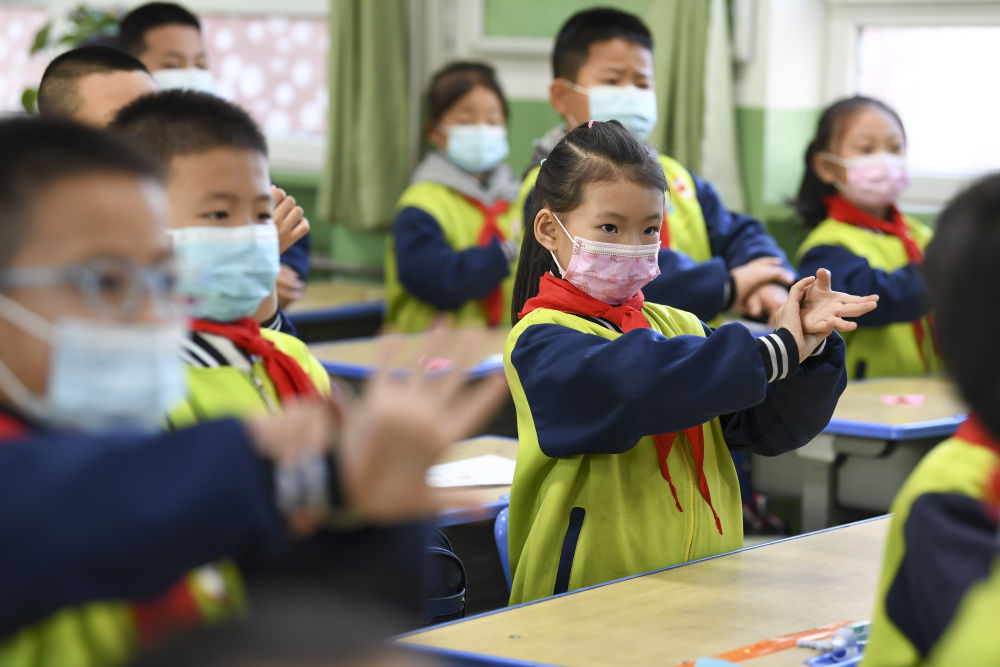 宁夏银川市兴庆区第四小学二年级2班学生在课堂上学习防疫洗手方法。