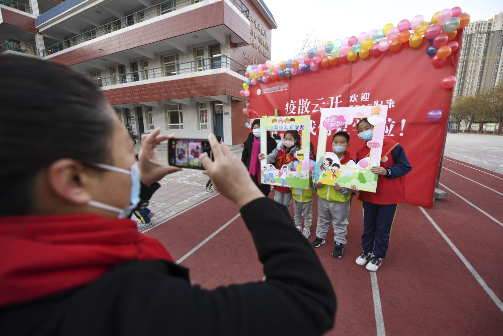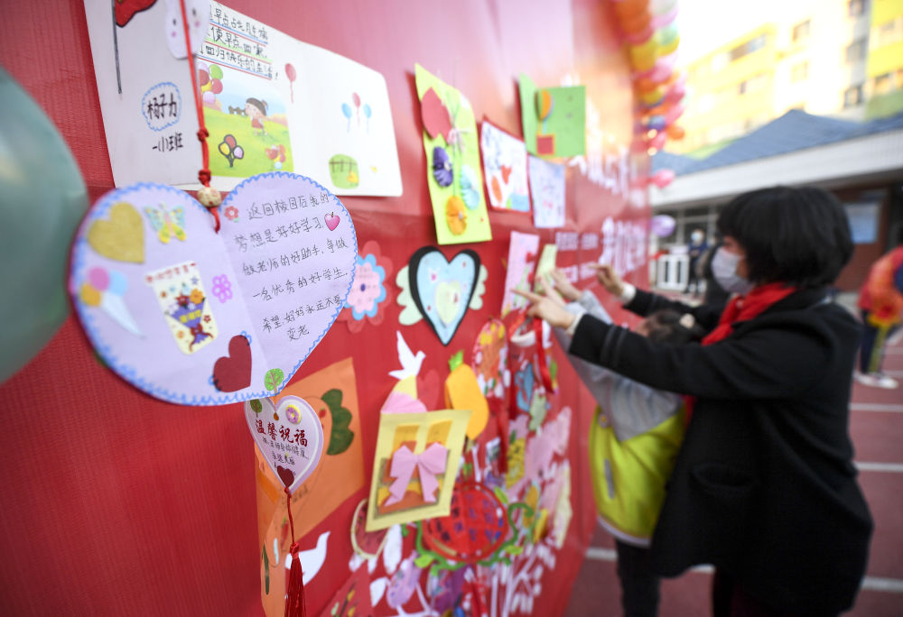 宁夏银川市兴庆区第四小学老师帮助学生将复学心愿卡贴在入校心愿墙上。