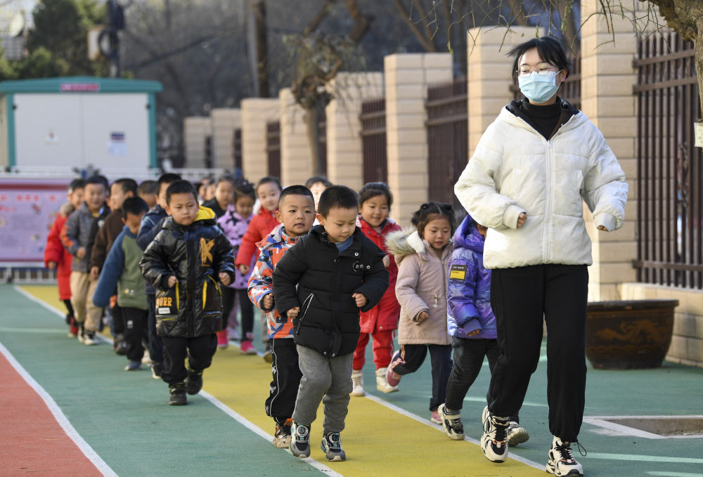 宁夏银川市第四幼儿园老师带着小朋友在户外热身跑步。