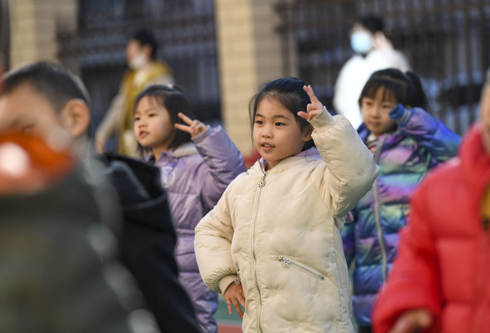 宁夏银川市第四幼儿园的小朋友在户外活动。