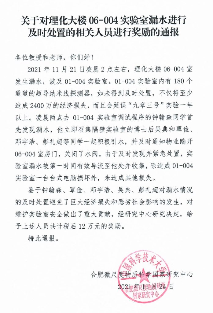 对此,该中心认为,5名学生的及时处置,避免了巨大经济损失和科研任务延误,因此决定给予5名学生共计税后12万元的奖励。
