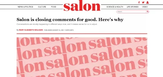 2021年9月30号,美国新闻与评论网站Salon正式关闭其评论区,其负责人表示,“当前受众与媒体的互动方式发生了很大程度的改变,我们也将因时而变进行调整”。