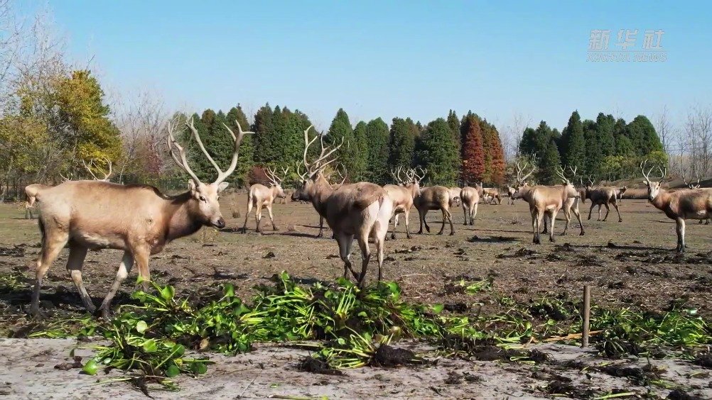 【#江苏溱湖湿地麋鹿越冬欢#】近日,为了让国家一级保护动物麋鹿顺利越冬,江苏省泰州市姜堰区溱湖国家湿地公园在原先水草喂食的基础上,专门安排工作人员增加了精饲料的补给,提高园内麋鹿抵御寒冷的能力。 新华社的微博视频