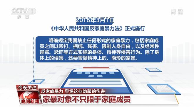 2016年3月1日,《中华人民共和国反家庭暴力法》正式施行,明确规定我国禁止任何形式的家庭暴力,包括家庭成员之间以殴打、捆绑、残害、限制人身自由以及经常性谩骂、恐吓等方式实施的身体、精神等侵害行为。除了身体上的侵害,还要警惕精神上的、隐形的家暴。